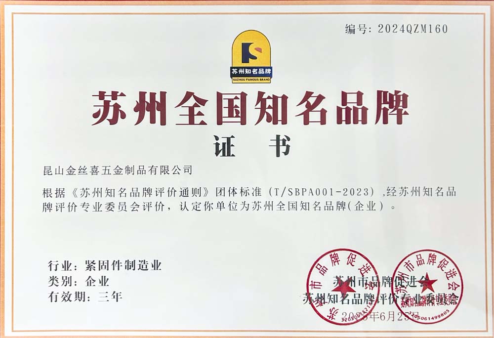 KunshanJinsixiMetalware Co., Ltd. on ametlikult pälvinud tiitel "Riiklik kuulsa kaubamärgi Suzhou" tiitel suurepärase tootekvaliteedi, juhtiva tehnoloogilise tugevuse, põhjaliku teenindussüsteemi ja ulatusliku turumõju eest!